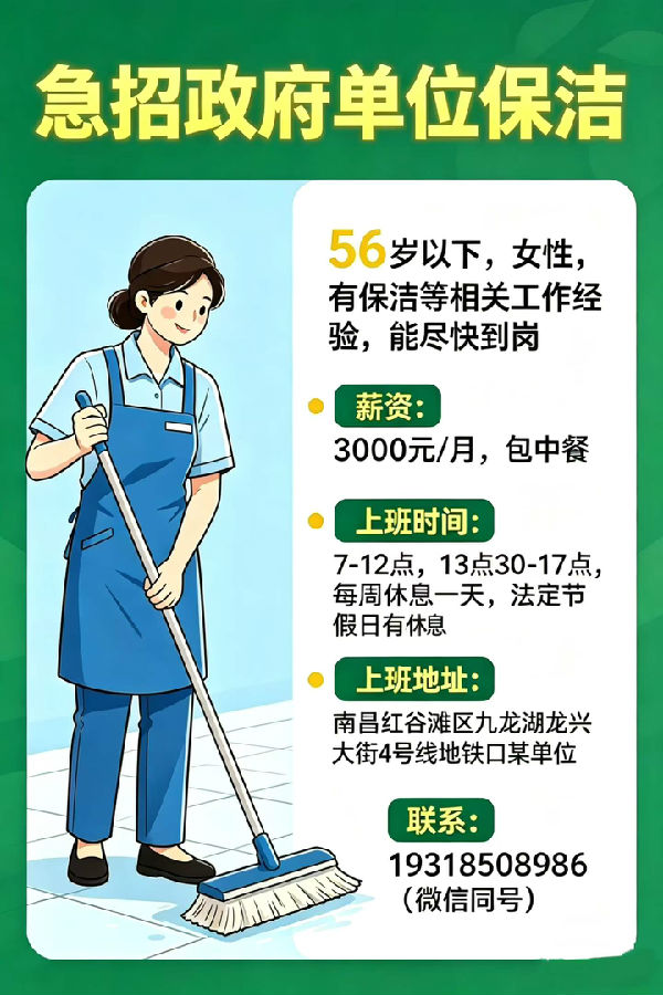 招聘保洁(包吃包住,一天工作8小时)